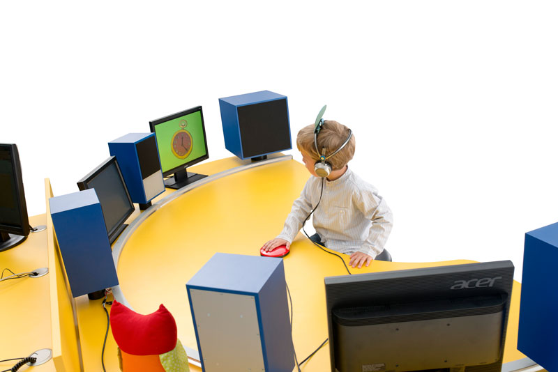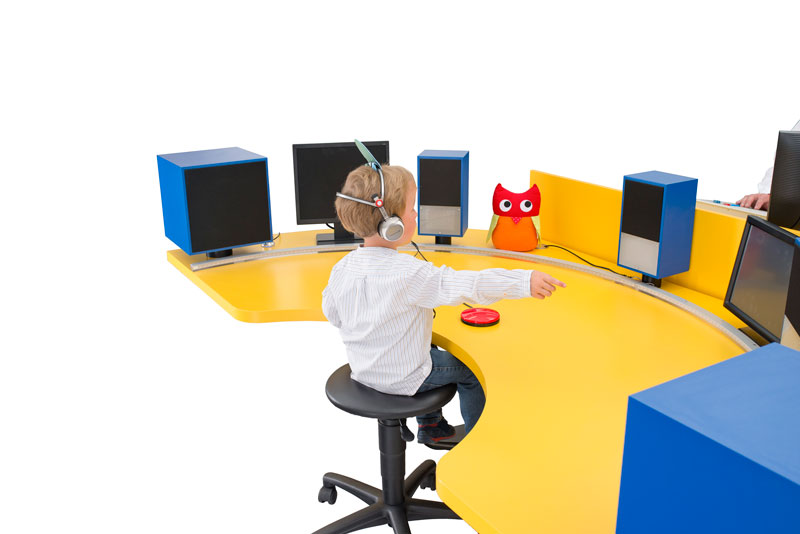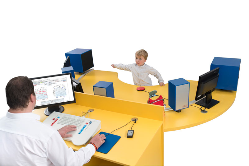 - Die Steuerung erfolgt über den Audiometrie – PC bzw. über die Audiometer-Bedieneinheit sowie über die Reaktionstasten auf dem Kindertisch.