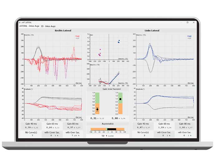 Zeitgleich messen integrierte Sensoren die Kopfbeschleunigung direkt an der Kameraeinheit. Neben dem Gain-Wert werden sowohl sichtbare (overt) als auch verdeckte (covert) Rückstellsakkaden zuverlässig erkannt, aufgezeichnet und dokumentiert – für eine umfassende und präzise Diagnostik.
